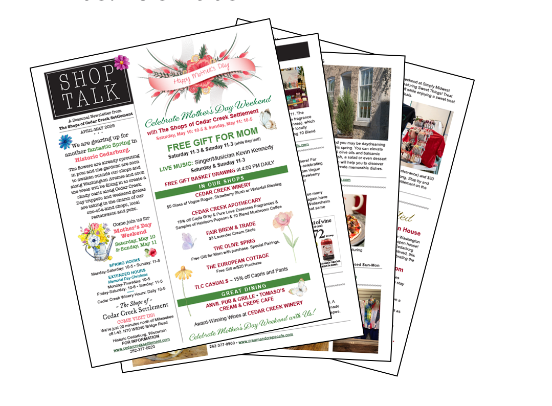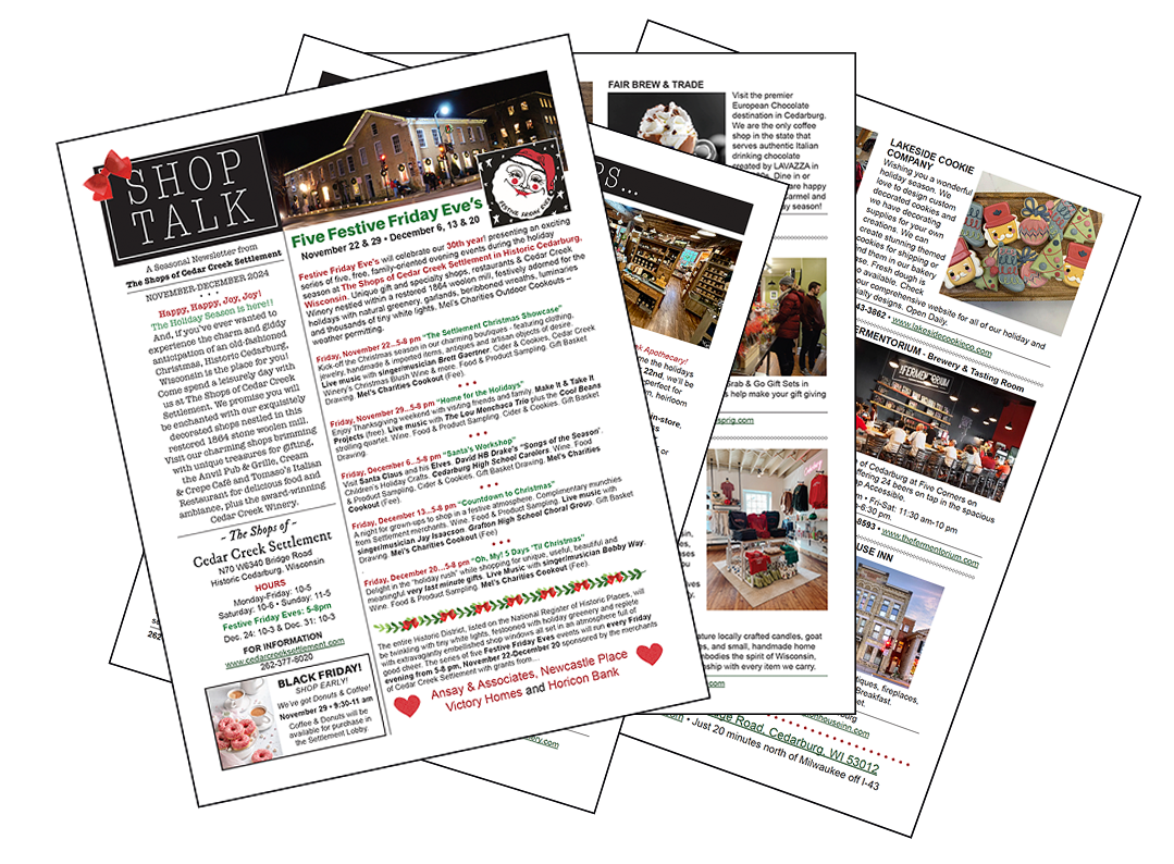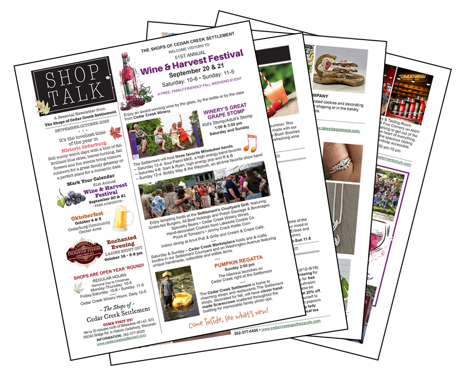 150 Years of History • Cedarburg’s Retail & Dining Destination • 20+ Shops, Restaurants & Winery in a Historic Setting